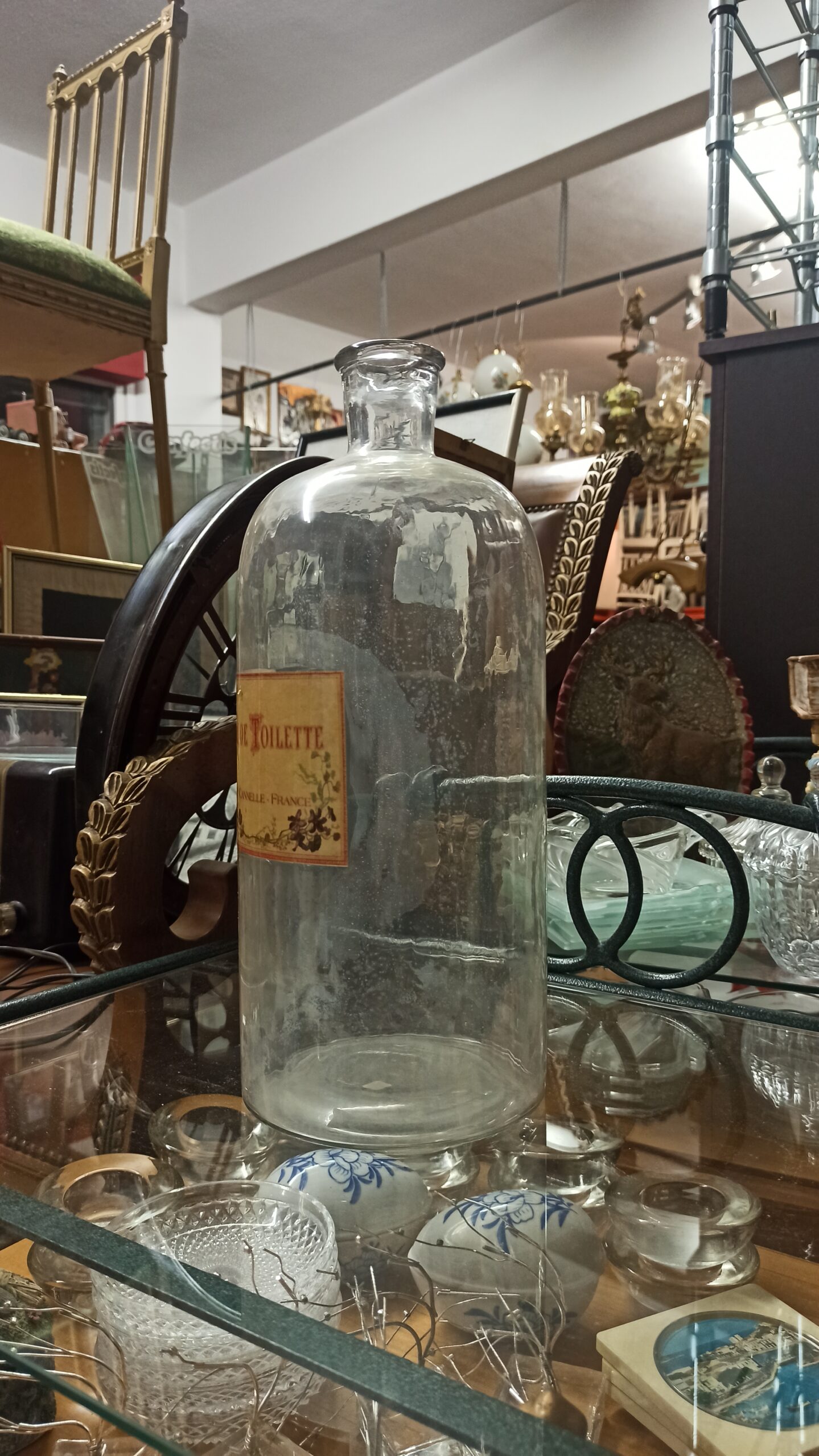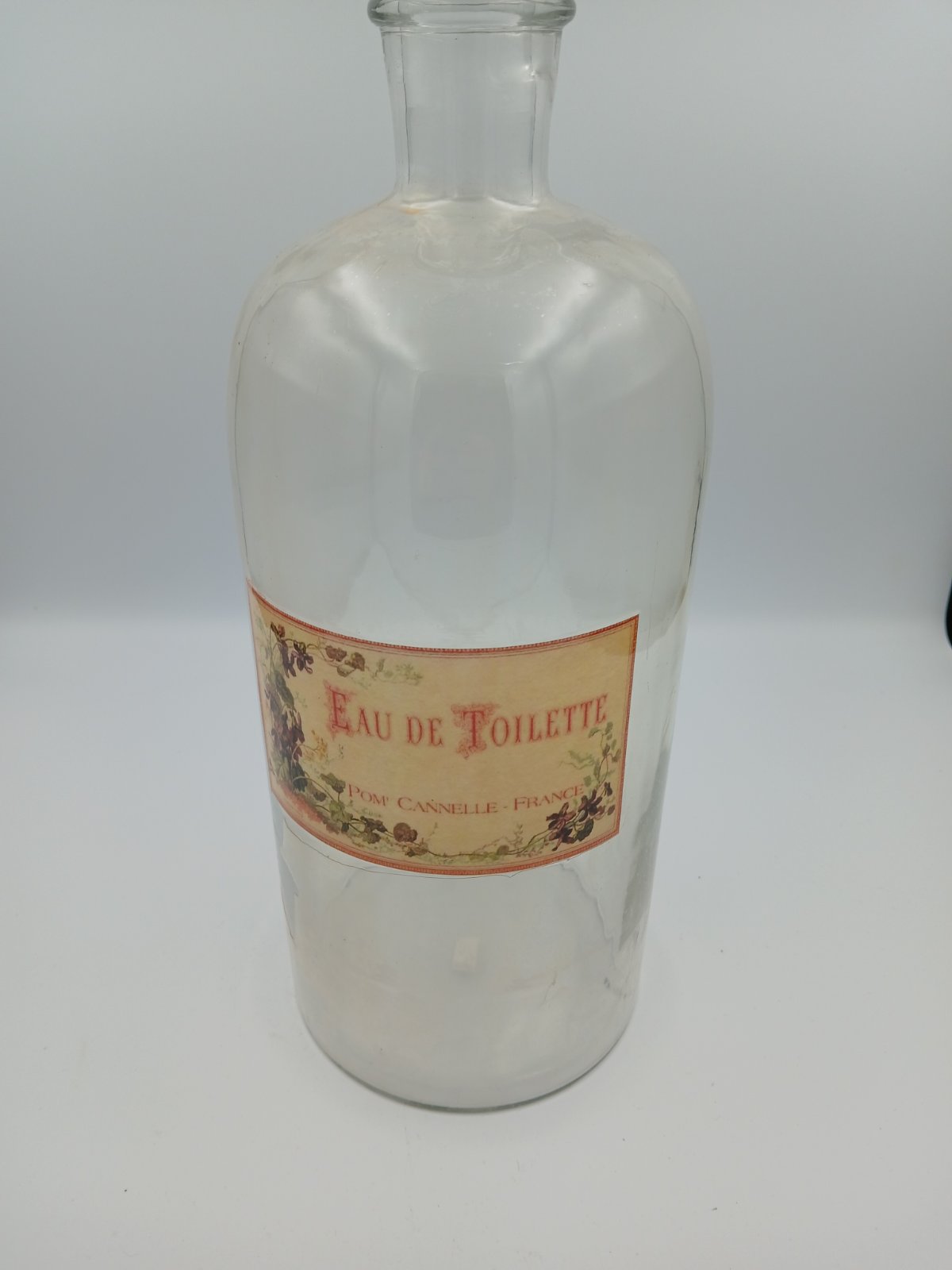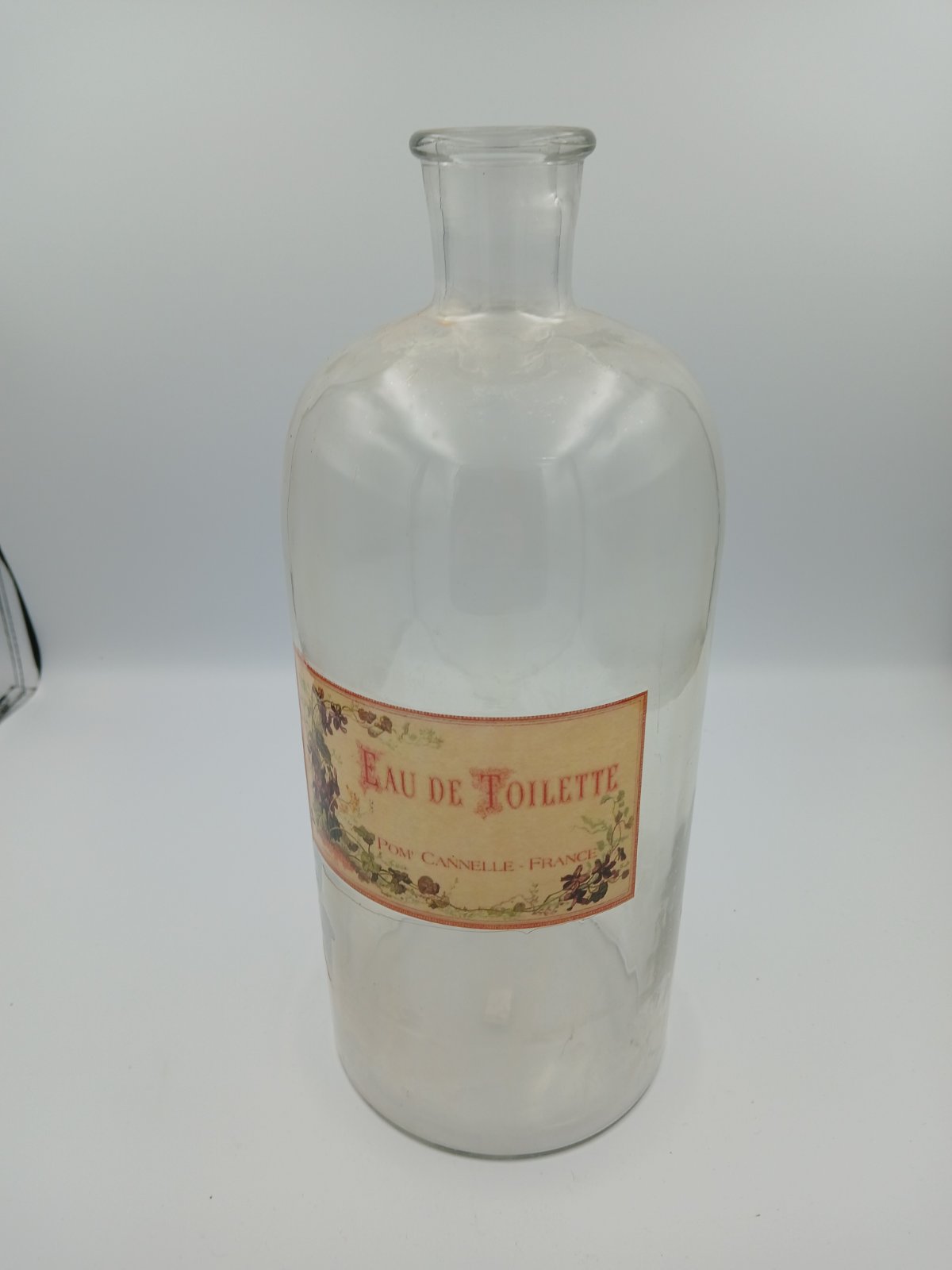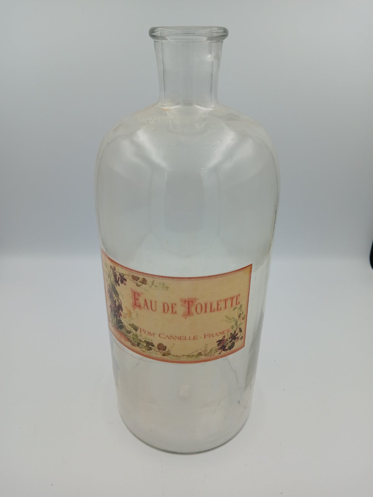 Γυάλινο μπουκάλι αρώματος τύπου Eau de Toilette, με απλό διαφανές σώμα και ρετρό ετικέτα σε γήινες αποχρώσεις, που παραπέμπει σε παλαιότερη γαλλική αισθητική.