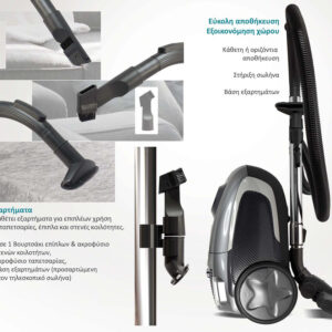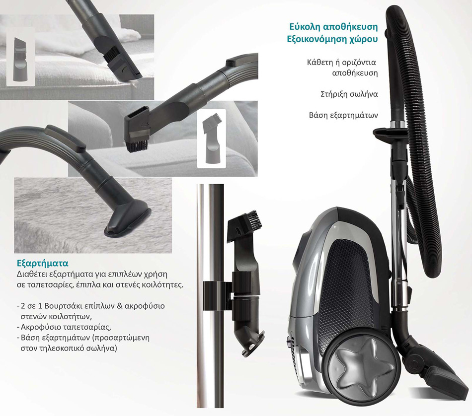 Αξεσουάρ: 2 σε 1 βουρτσάκι επίπλων & ακροφύσιο στενών κοιλοτήτων, Ακροφύσιο ταπετσαρίας, Βάση εξαρτημάτων