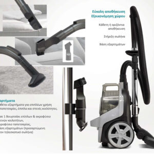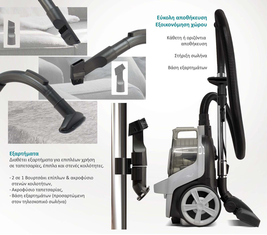 Αξεσουάρ: 2 σε 1 Βουρτσάκι επίπλων & ακροφύσιο στενών κοιλοτήτων, Ακροφύσιο ταπετσαρίας, Βάση εξαρτημάτων