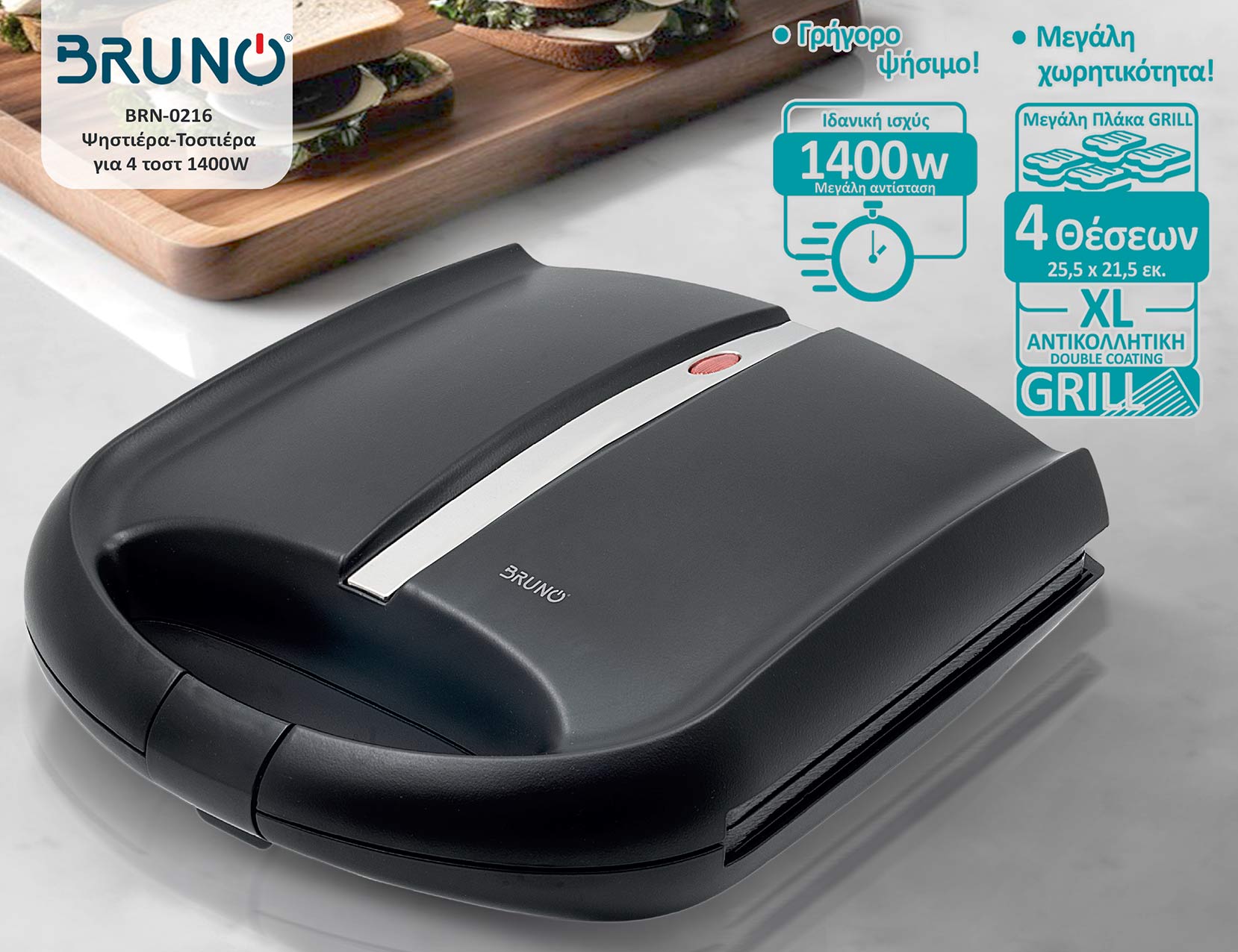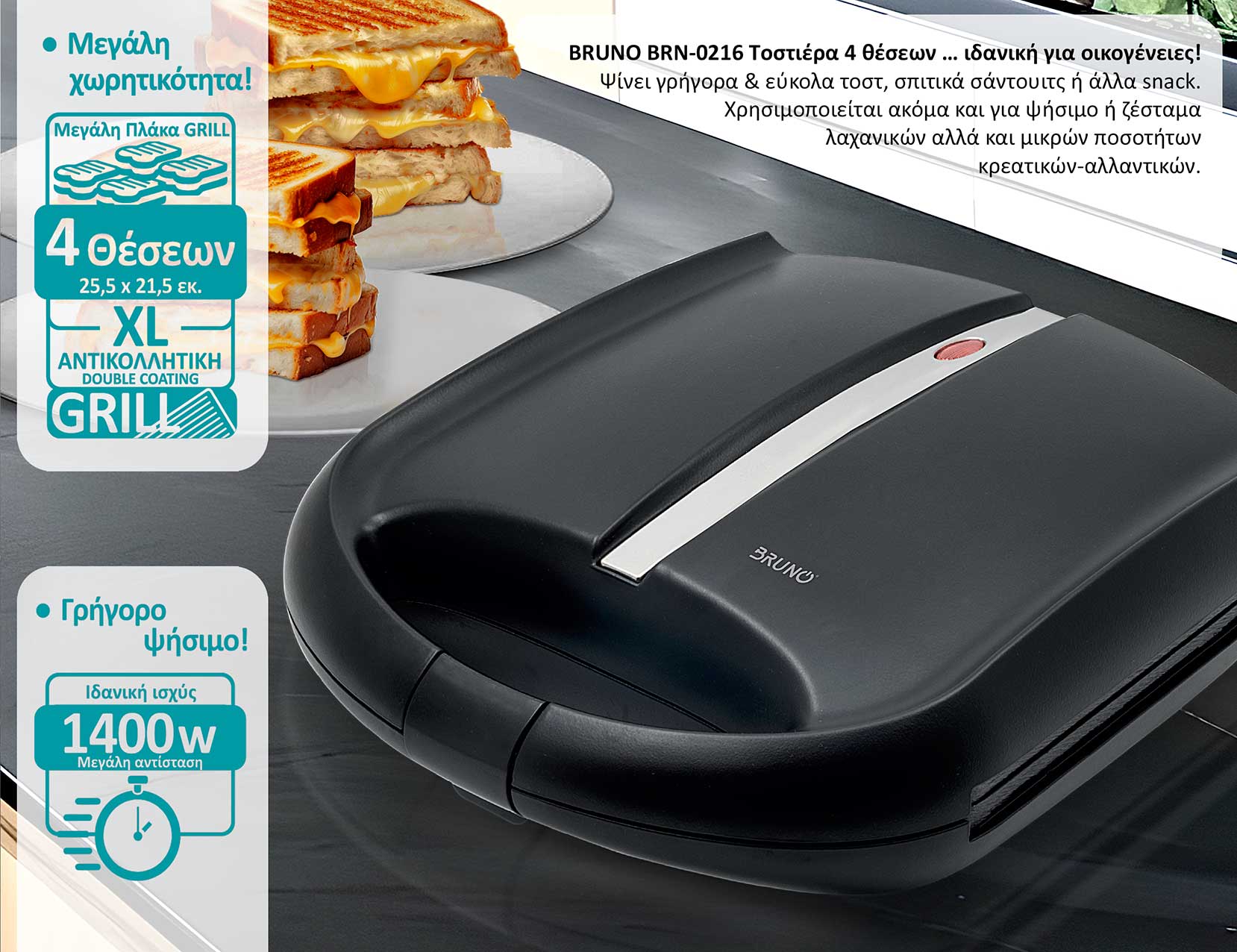 Με ισχύ 1400W και μεγάλη αντίσταση υπόσχεται γρήγορη προθέρμανση και γρήγορο ψήσιμο.