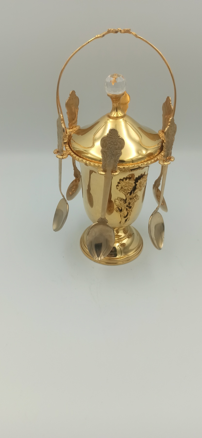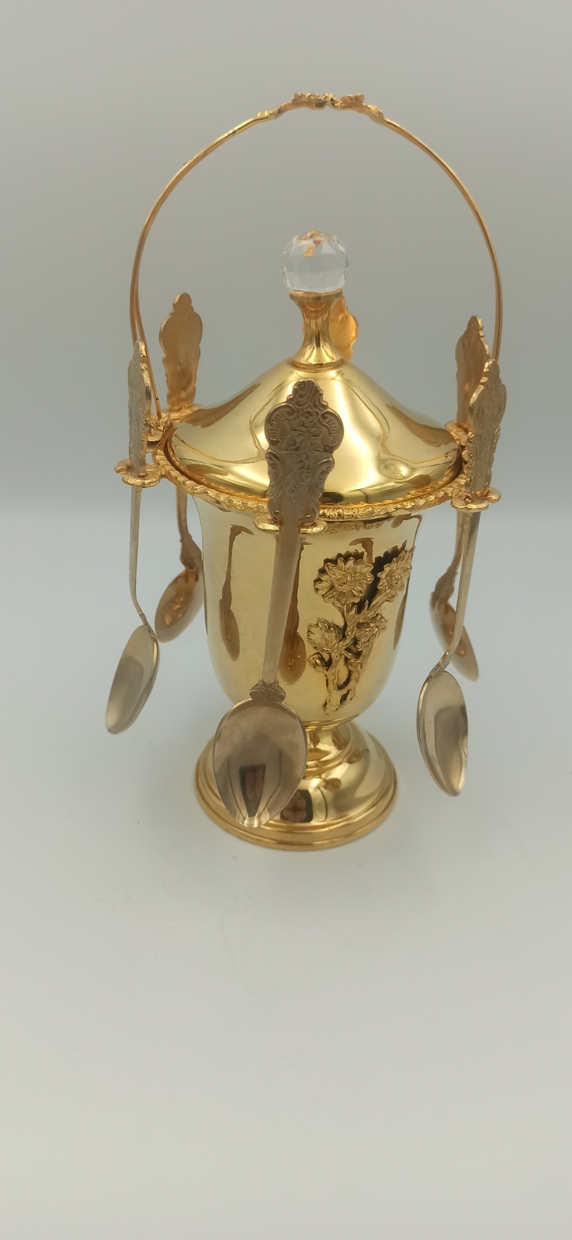 δοχείο ζάχαρης με ενσωματωμένη θήκη για κουτάλια, περίτεχνος σχεδιασμός στα κουτάλια και η βάση τύπου “pedestal” παραπέμπουν σε Νεοκλασικό ή Βικτωριανό στυλ.