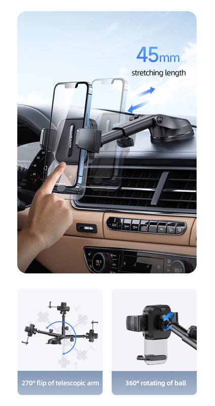 Διαθέτει τηλεσκοπικό βραχίονα και στερεώνεται εύκολα με ισχυρή βεντούζα σε οποιαδήποτε επίπεδη επιφάνεια του αυτοκινήτου.